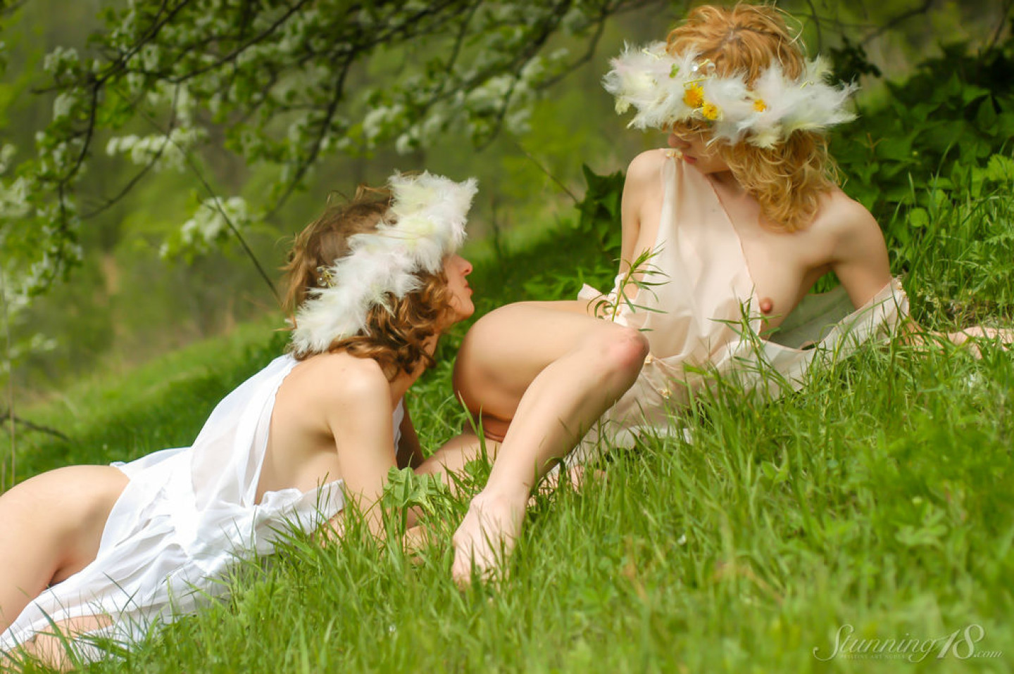 Teen lesbians Dorinda N & Electra U wear crowns of flowers while getting naked