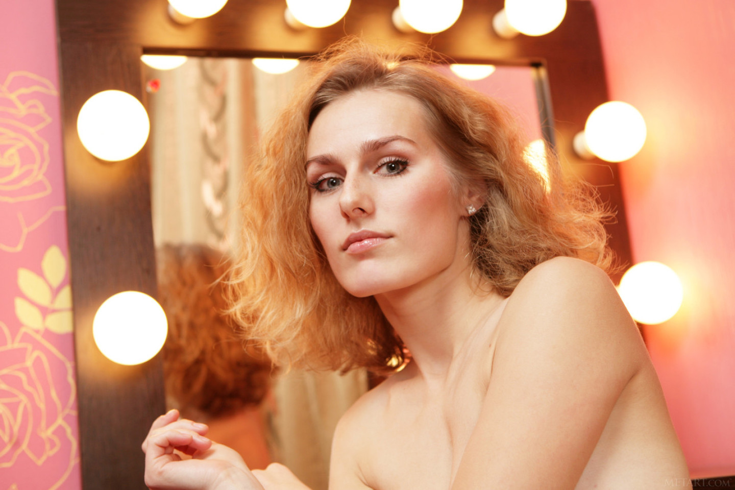 Mature beauty with curly hair Liza K strips at her vanity and poses butt naked