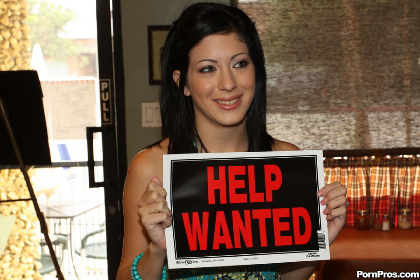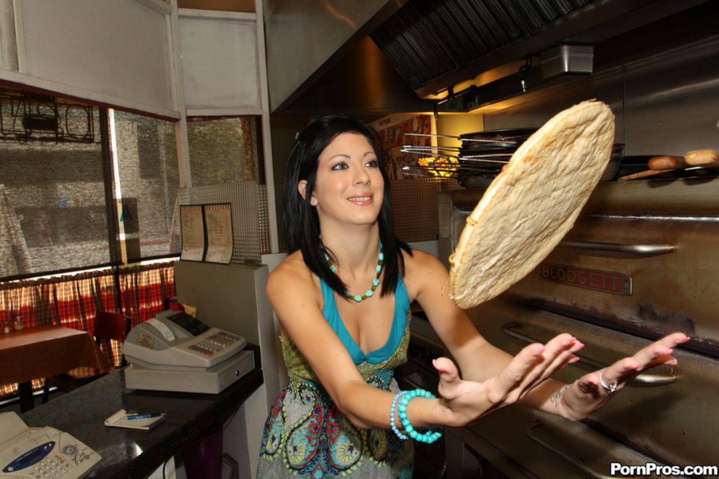 Dark-haired teen Kenna Kane licks cum from her lips after sex in a pizza shop
