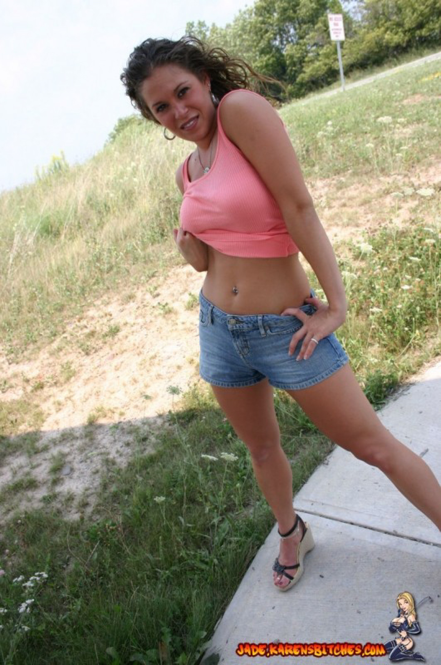 Clothed teen exposes her flat stomach on a sidewalk in denim shorts