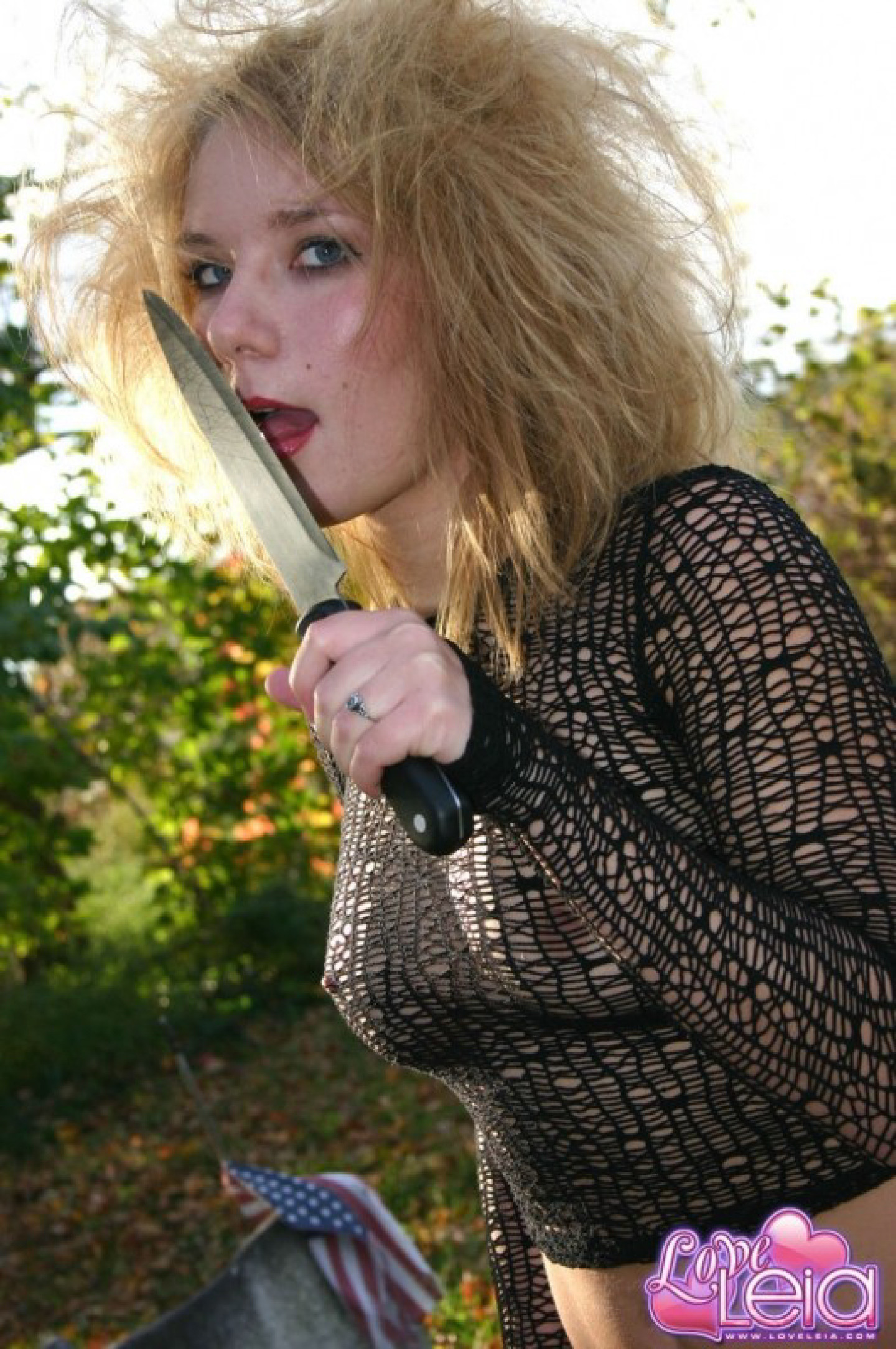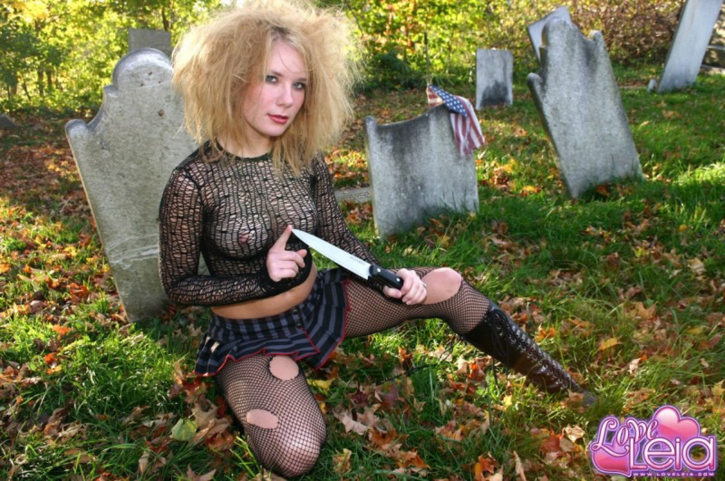 Amateur model lick a knife while wearing ripped stockings in a graveyard