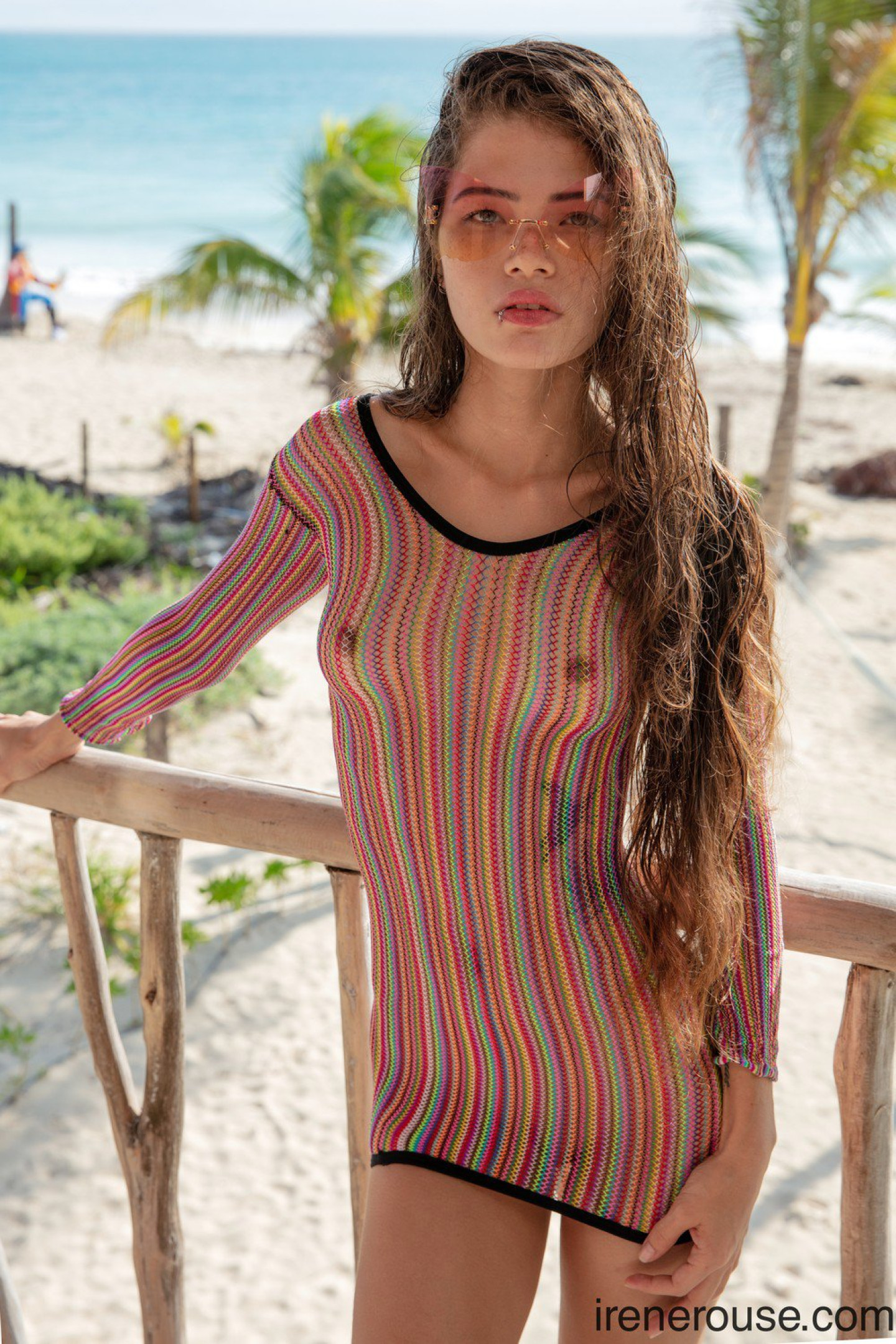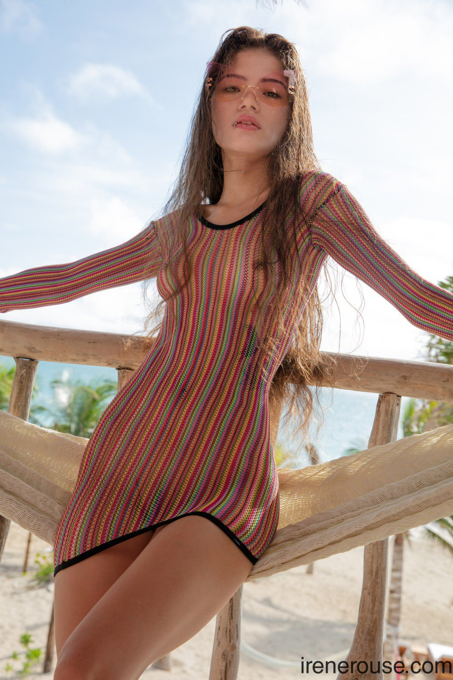 Flexible chick Irene Rouse showing her tight pussy outdoors