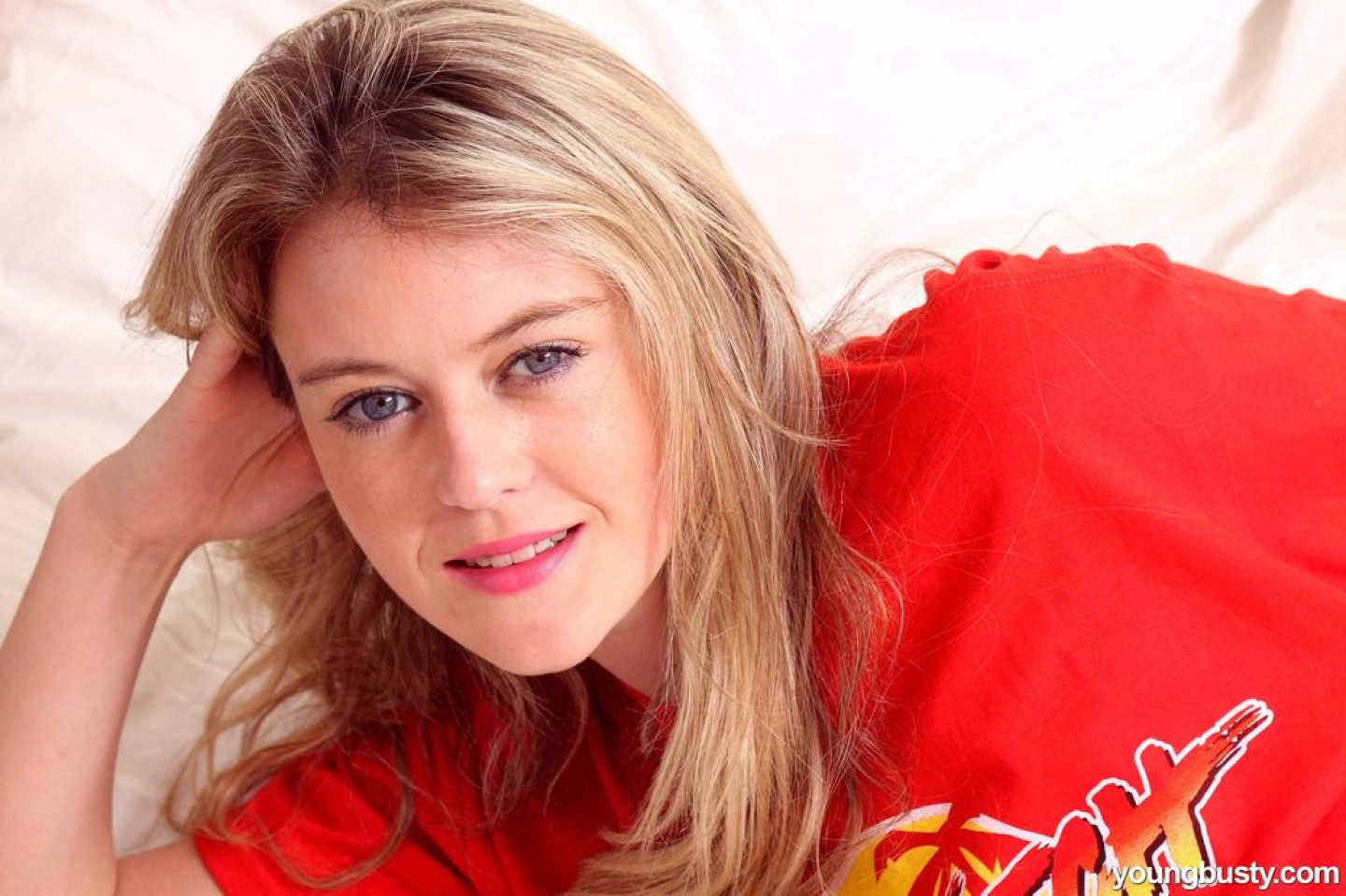 Cute blonde teen Brook rocks her big breasts in red high heels and a thong